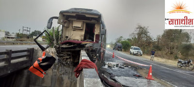 (छायाचित्र: चालकाला डूलकी लागल्याने सैनी ट्रॅव्हल्सची बस दूभाजकाला धडकून अशी अपघातग्रस्त झाली!बसचा समोरचा भाग पूर्णपणे अपघातग्रस्त झाला)