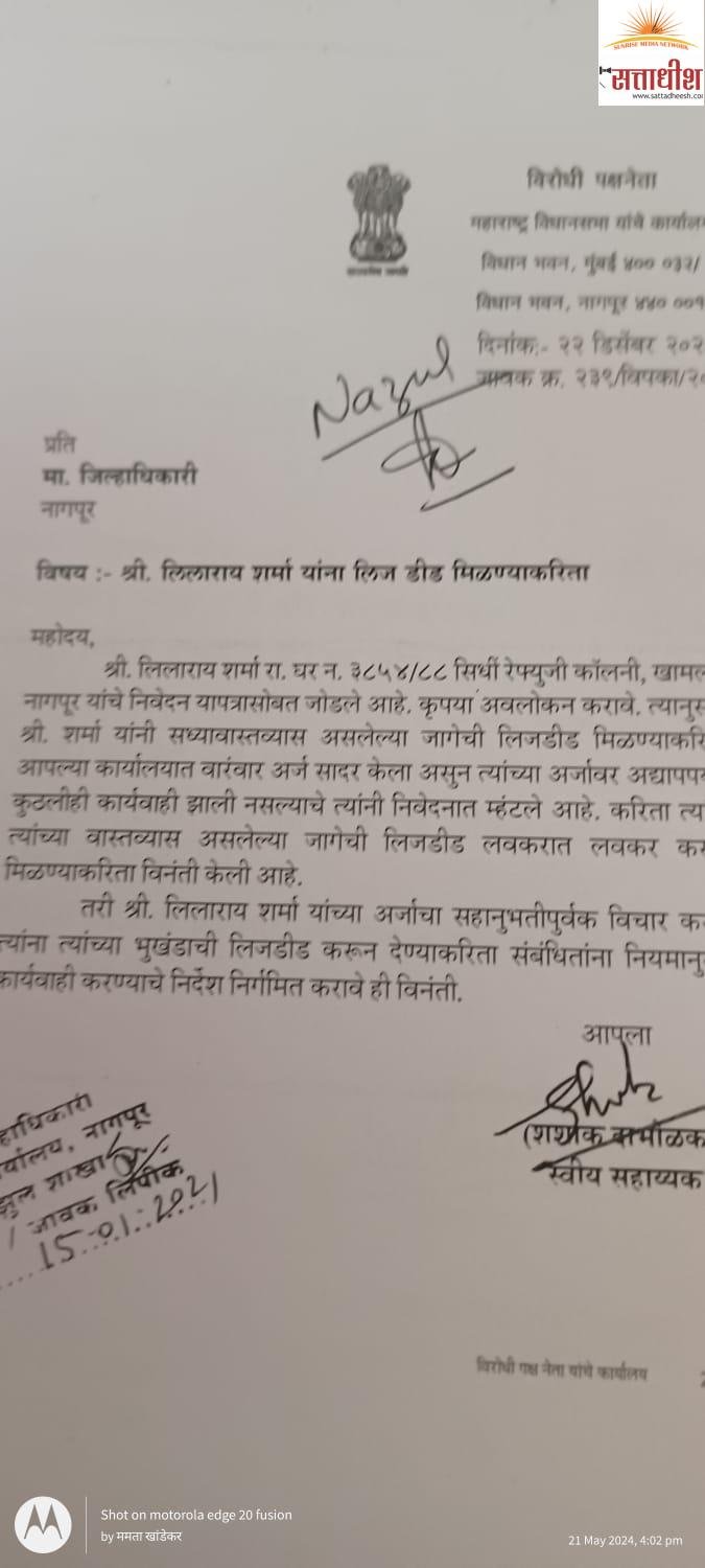 जिल्हाधिकारी डॉ.विपीन इटनकर यांच्या निर्दशनास ही बाब आली असता, त्यांनी २३ फेब्रुवरी रोजी अपर मुख्य सचिव,महसूल,मंत्रालय मुंबई यांना पत्र पाठवले असून,योग्य मार्गदर्शन मागवले आहे.फाळणीच्या वेळी विस्थापित झालेले सिंधी बांधव मागील ७५ वर्षापासून वास्तव्यास असून त्यांना मालकी हक्काचे पट्टे वाटप करण्याचा शासन निर्णय जारी झाला आहे.मात्र,नागपूर शहरात विविध विस्थापितांच्या वासहतींमध्ये वसाहत करीत असलेल्या निर्वासितांकडे नोंदणी केल्याबात(रेफ्यूजी)असल्याचे पुरावे उपलब्ध नाहीत.त्यामुळे शासन निर्णय २० जुलै १९८२ नुसार ज्या व्यक्तीकडे रेफ्युजी पुरावे नसल्यास ‘कॉलम-ए तील (एफ)नुसार कार्यवाही अपेक्षीत आहे.या कलमानुसार अधिक भाेगवटामूल्य येत असल्याने विस्थापीत नागरिकांना ‘कॉलम-ए’तील (डी)प्रमाणे प्रती स्के.फूट २०० रुपये आकारुन भुखंडाचे पट्टे वाटप करण्याबाबत सिंधी समाजाच्या प्रतिनिधी व अतिक्रमणधारकांनी विनंती केली आहे.कॉलम-ए तील(डी)नुसार कार्यवाही करावी किंवा कसे?याबाबत मार्गदर्शन करण्याची विनंती करणारे पत्र जिल्हाधिकारी डॉ.विपीन इटनकर यांनी पाठवले असून,जून महिना उजाडला तरी देखील लोकसभेच्या निवडणूकीच्या धामधुमीत संपूर्ण सरकार व प्रशासनच व्यग्र असल्याने, नागपूरातील फार मोठ्या जनतेशी सरळ संबंध येत असलेल्या या पत्रावर मंत्रालयातून(महसूल)अद्याप तरी कोणतेही उत्तर अप्राप्य असून,लीलाराय किवा त्यांच्यासारख्या असंख्य सिंधी समाजातील शरणार्थींना त्यांच्या न्याय हक्कासाठी आणखी किती दशकांचा लढा द्यावा लागेल,याकडे आता जागरुक नागपूरकरांचे लक्ष लागले आहे.